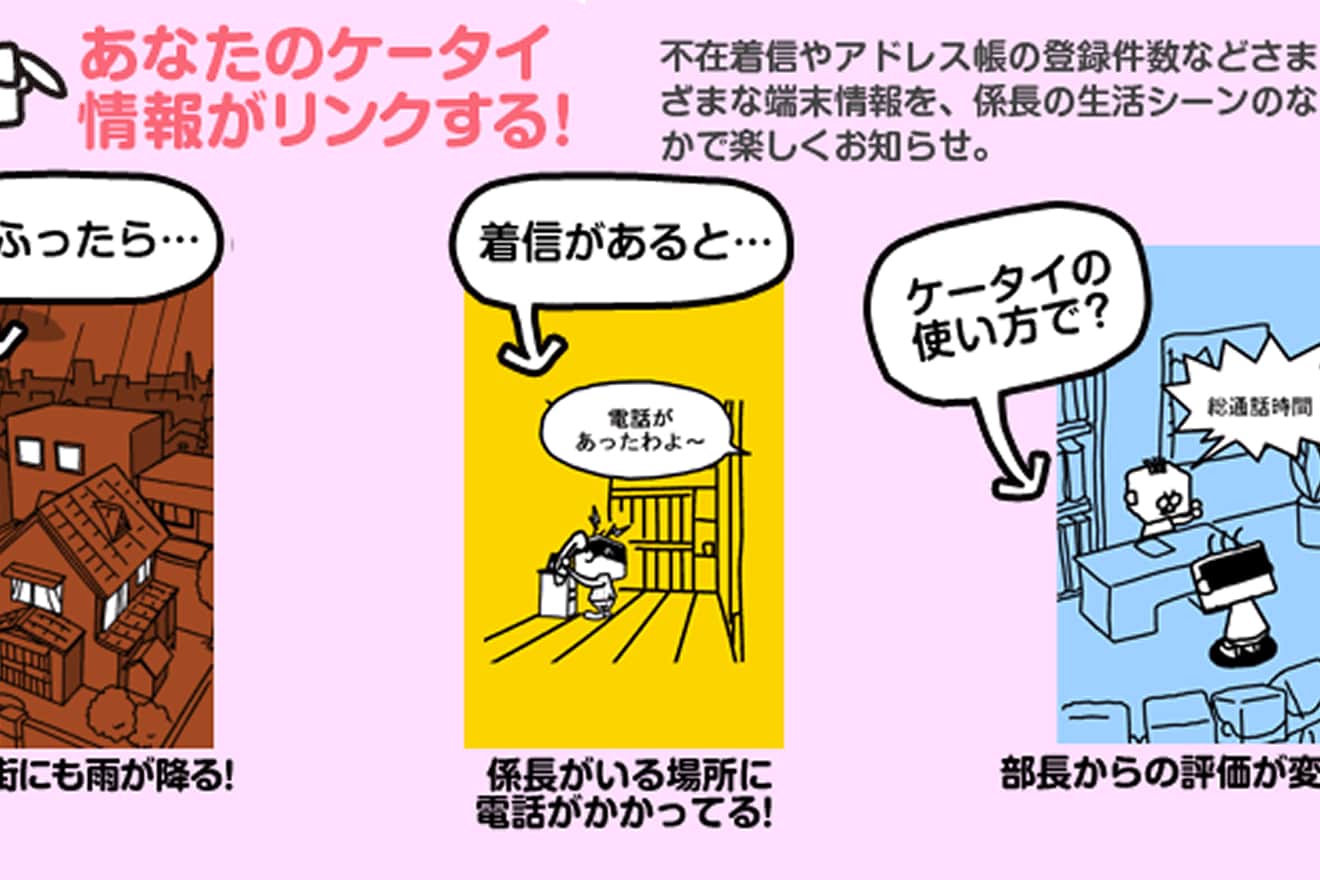 「カスタモ」が軌道に乗ると、プライムワークスでも独自にIPを保持できないかといったチャレンジにも着手することとなります。その中の一つで、私が企画・デザインを手がけた「ケータイ係長」はソフトバンク向けのシャープ端末に搭載されました。時間や天気、曜日などに連動して係長が色んなアクションを見せるという、Flash技術を活用した待受けコンテンツで、当時では画期的だとして色々なメディアにも取り上げていただきました。