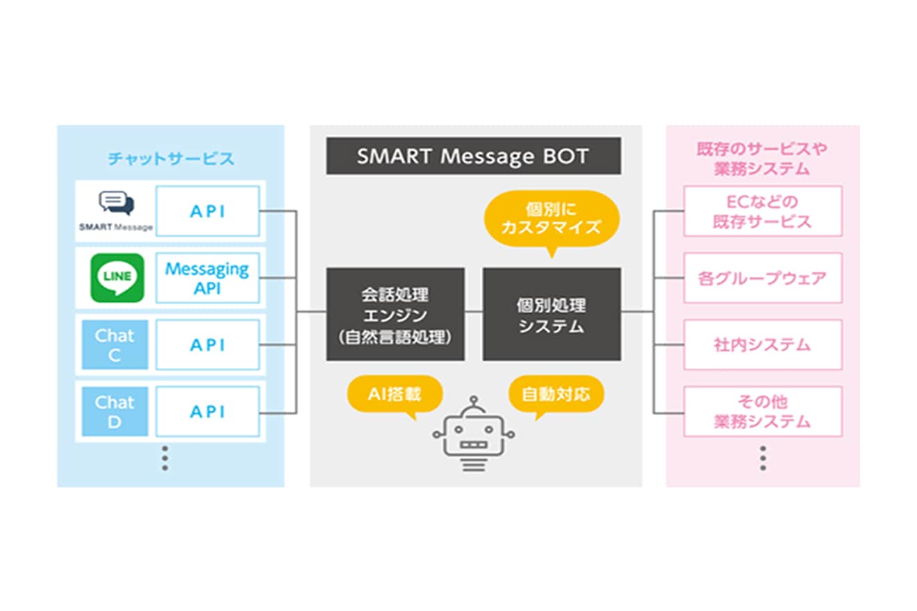 事業の進退が問われる中で、チャット機能に付加価値を与える“チャットボット”という新たな概念に活路を見出します。ちょうどFacebookがチャットボット向けのAPIを公開し、世界的にもチャットとAIを組み合わせたサービスの可能性が注目され始めた頃でした。私たちが構想したのは、既存のチャットサービスに接続し、自然言語ベースで業務の自動化を実現する“業務用チャットボット”。自然言語処理の仕組みと、顧客の多様な業務ロジックに応じてアプリケーションをカスタマイズできる拡張性を兼ね備えたチャットボットプラットフォームとして、2016年末に「SMART Message BOT」を開発し、提供を開始しました。これが、現在の「OfficeBot」へとつながる、ネオスのAI事業の原点です。